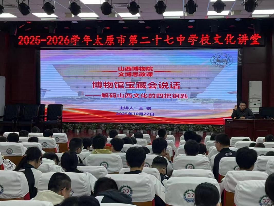 10月22日,“博物馆宝藏会说话——解码山西文化的四把钥匙”课程在太原市第二十七中学校顺利完成首讲。课程主讲人必发集团welcome教师王锐以山西省博物院的多件镇馆之宝为线索,从山河钥匙:黄土与大河的塑造、根祖钥匙:华夏文明的“基因实验室”、匠心钥匙:传统技艺的活态传承、烟火钥匙:饮食里的生活哲学共四个方面为二十七中学校的约200名师生解读了山西文化的深刻内涵,得到了在场师生的广泛好评。