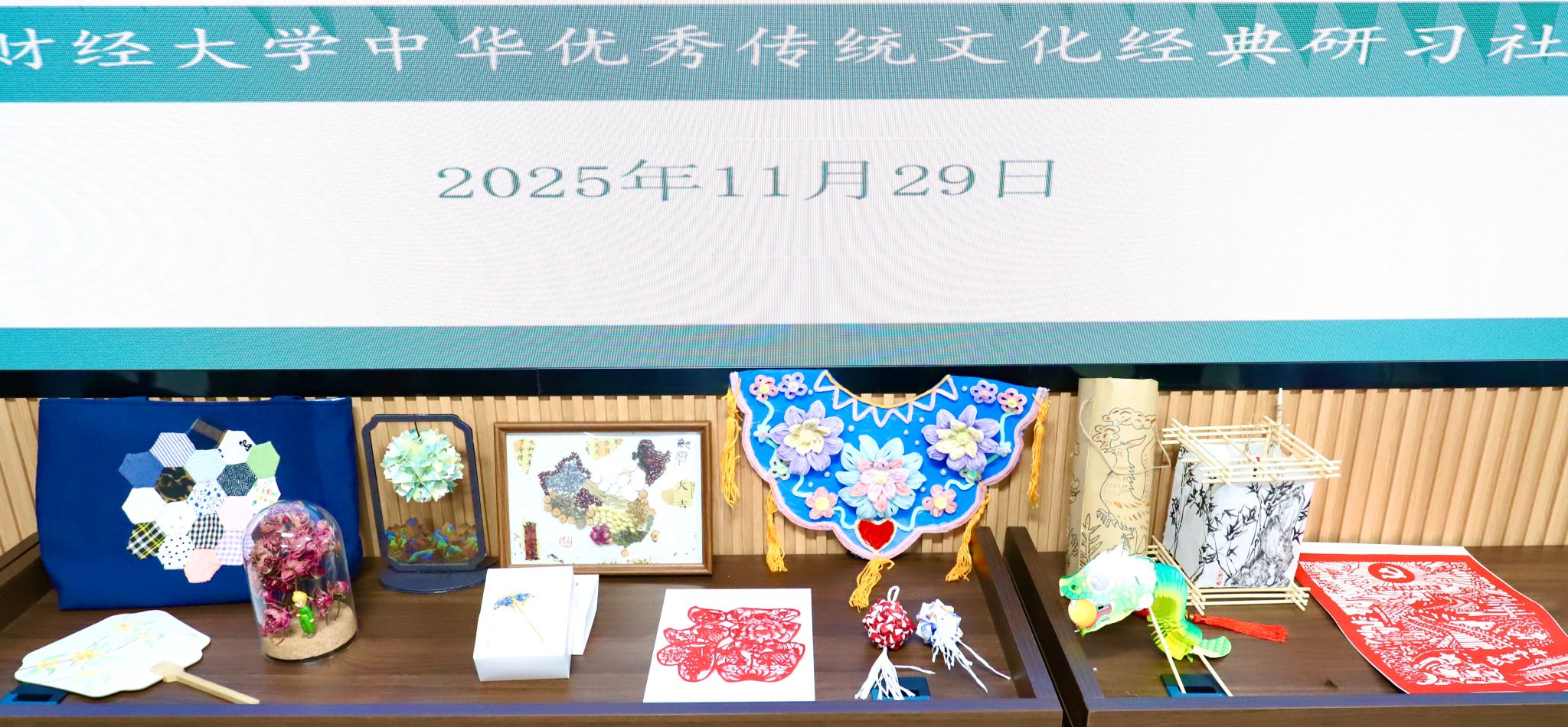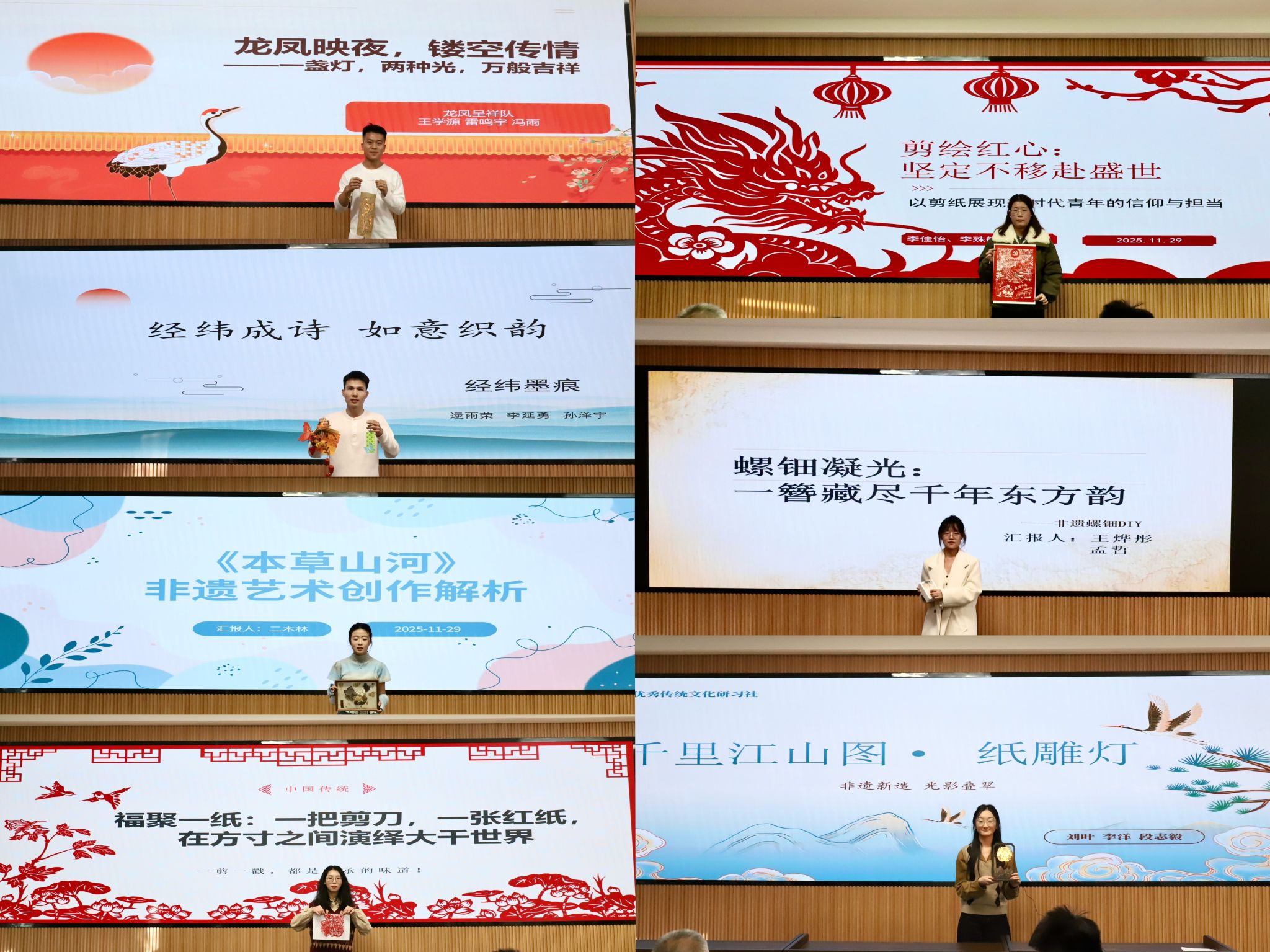 非遗焕新,创意破界。本次大赛自启动以来,得到广大学生积极响应,历经初赛严格筛选,13组作品脱颖而出。参赛选手以非遗技艺为根基,紧扣时代脉搏,将纸编、剪纸、中药炮制、螺钿、拼布等传统工艺与现代生活需求相结合,打造出兼具文化内涵与实用价值的创意作品。经纬墨痕队的纸编挂饰与书签,以“变废为宝”的生态智慧诠释勤俭节约的传统美德。福气满满队的剪纸“福”字,融合牡丹、锦鲤、石榴等吉祥元素,传递富贵安康的美好祈愿。草木山河队以中药炮制技艺为核心,构建本草地理美学图景,实现非遗与跨学科设计的创新融合。龙凤呈祥队的镂空光影灯,将龙凤吉祥符号与现代照明功能结合,让传统文化融入日常起居。此外,螺钿发簪、千里江山图纸雕灯、绒花云肩、咖啡袋绣球、拼布等作品,有的巧用环保材料传递生态理念,有的融入科技元素契合时代节拍,有的创新表现形式焕发非遗活力,生动诠释了“非遗新造”的深刻内涵。比赛现场,选手们通过PPT展示、实物演示等方式,详细阐述创作理念、制作工艺与文化价值,展现出青年一代对中华优秀传统文化的深刻理解与创新表达。